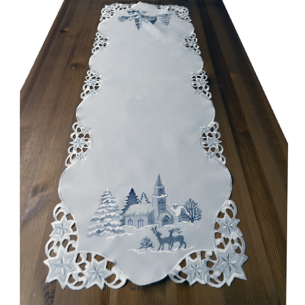 40/110 weiß-grau-silber Stickerei "Winterlandschaft/Kirche"(